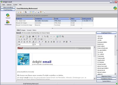 Flexibles und integrationsfähiges Email- und SMS-Marketing. Versendet personalisierte Serien-Emails und Serien-SMS an ihren Adressbestand. Mit integriertem Email-Designer, HMTL-Quelltext-Option, Textblöcken, selbst definierbaren Makros- und Adressfelder, personalisierbaren Dateianhängen sowie umfangreichen Import- und Integrationsmöglichkeiten.