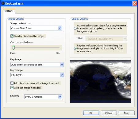Desktop Earth bringt als Hintergrundbild Satellitenbilder der Erde basierend auf NASA’s Blue Marble Next und Earth’s City Lights. Dabei können manuell oder automatisch nach Kalendermonat unterschiedliche Bilder genutzt werden um im Winter schneebedeckte Regionen zu zeigen. Auf Wunsch lassen sich aus dem Internet aktuelle Wetterdaten laden um leicht zeitversetzt aktuellen Wolken darzustellen.