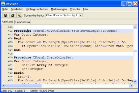 - zeilenweise Einfärben des Quelltextes (mit individuellen einstellbaren Farben)