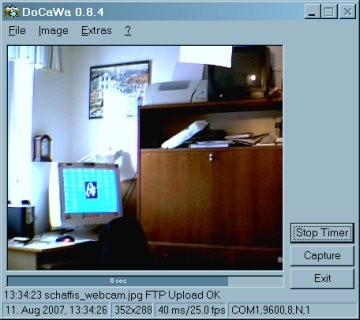 DoCaWa macht Schnappschüsse mit einer USB-Webcam. Dabei gibt es mehrere Möglichkeiten zum Auslösen: Über einen COM-Port, manuell, zeitintervalgesteuert oder über Telnet. Die Bilder können automatisch auf mehrere FTP-Server hochgeladen werden. Durch den integrierten Telnet-Server lässt sich das Programm z.T. fernsteuern.