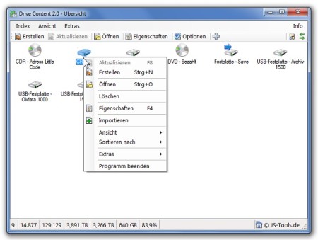 Drive Content erstellt von externen Festplatten oder CD/DVDs einen kompletten Index. Dieser Index beinhaltet die komplette Ordner- und Dateistruktur des Datenträgers. Sie können diesen Index durchsuchen, obwohl der Datenträger nicht angeschlossen oder eingelegt worden ist.