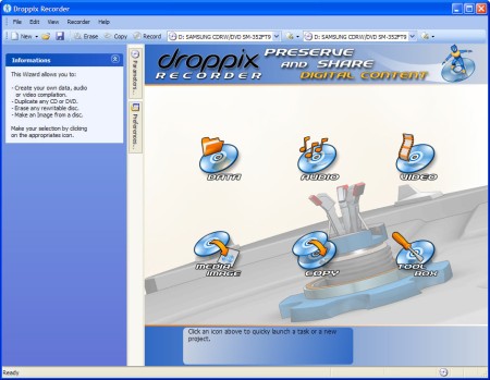 Droppix Recorder ist eine neue, einfach zu bedienende und mächtige Brennsoftware zum Erstellen oder Kopieren von CDs und DVDs, Zusammenstellen von Musiksammlungen, Aufbereiten Ihrer Urlaubsfilme für den heimischen DVD-Player (DVD, SVCD, VCD), Erstellen oder Konvertieren von ISO-Images und vielen weiteren Anwendungen...