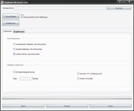 Duplicate File Eraser findet und entfernt doppelt oder mehrfach vorkommende Dateien. Mehrfach vorkommende Dateien belegen unnötigen Speicherplatz, der mittels diesem Programms freigegeben werden kann. Die Dateien werden während des Suchlaufs mittels MD5 nur nach Inhalt und nicht nach Namen oder Größe verglichen. Nach dem Suchlauf werden die Ergebnisse in einer Liste angezeigt. Die Duplikate können wahlweise gelöscht oder in den Papierkorb verschoben werden.