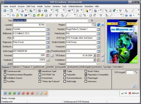 Programm zur Verwaltung von DVD-Sammlungen. Features: Detail- und Listenansicht, Verwaltung verliehener DVDs, alle Informationen einer DVD (incl. Titelbildgrafik) können verwaltet werden, Datenblätter und Listen (mit verschiedenen Sortierungs- und Filtermöglichkeiten) drucken, Listen in unterschiedlichen Formaten exportieren, Filtermöglichkeiten für Export, Export für Palm Pilot (incl. Viewer), Export für PocketPC, Import für verschiedene Formate