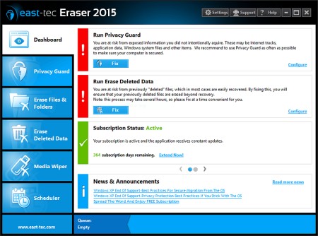 Schützen Sie Ihre Daten und Ihren Privatbereich, und entfernen Sie alle Daten Ihrer Computer- und Onlineaktivitäten mit dem East-Tec Eraser. Der Eraser übertrifft die U.S. D.o.D. Standards für endgültige Löschung digitaler Informationen und entfernt alle Spuren sensibler Daten von Ihrem PC: Verlauf, Webseiten, Bilder, unerwünschte Cookies, Chat-Gespräche, und alle Spuren vorherig gelöschter Dateien, vertraulicher Dokumente, oder Emails.