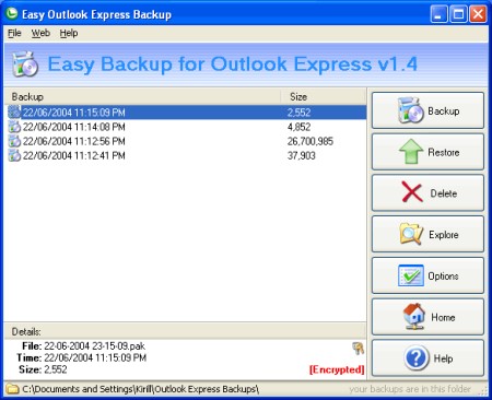 Mit Easy Backup for Outlook Express erstellen Sie Sicherheitskopien all Ihrer Daten und Einstellungen von Outlook Express. Die Shareware sichert Nutzerprofile, E-Mails, E-Mail-Regeln, Ihr Adressbuch, Listen blockierter Absender und Signaturen. Alle Informationen und Daten werden in verschlüsselten Dateien gespeichert, die anschließend auf CD gebrannt oder auf einem beliebigen anderen Datenträger aufbewahrt werden können...