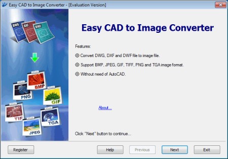 DWG to Image Converter: Konvertiert Vektorgrafiken sowie DWG-, DXF- und DWF-Dateien in Bild-Formate; unterstützt unter anderem die Formate BMP, TIFF, JPG, GIF, PNG und PCX sowie AutoCAD R2.5 bis R2008; erhältlich als GUI- und Kommandozeilen-Version.