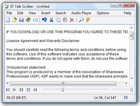Der EF Talk Scriber ist eine Kombination aus Textbearbeitungsprogramm und Audioplayer und dient der einfachen und schnellen Erfassung von Tonaufnahmen. Spezifische Verbindungen zwischen Text und Ton stehen zur Verfügung. Ihre Hände brauchen die Tastatur nicht zu verlassen, wenn Sie einen gesprochenen Text mit der Computertastatur eingeben.