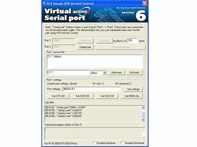 Eltimas Virtual Serial Port ActiveX Control ist ein Programm für professionelle Entwickler. Es erlaubt die Erstellung der virtuellen seriellen Schnittstellen und volle Kontrolle über sie. Virtuelle serielle Schnittstellen sind für andere Windows-Anwendungen real. Man kann die von anderen Anwendungen an serielle Schnittstelle gesendeten Daten kontrollieren und darauf antworten, indem man eigene Daten an virtuelle Schnittstelle sendet.
