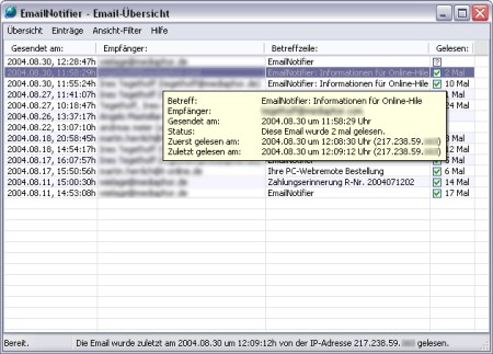 Die Software EmailNotifier ist eine Erweiterung für fast alle E-Mail-Programme (z.B. Outlook, oder Outlook Express). Sie hängt jeder ausgehenden E-Mail einen (auf Wunsch sogar unsichtbaren) externen Link an. Sobald der Empfänger die Nachricht öffnet, wird der Zugriff des externen Links protokolliert. Der Absender erhält so Informationen über Datum, Uhrzeit und IP-Adresse des Lesevorgangs. Exportmöglichkeit der Innformationen als XML-Datei.