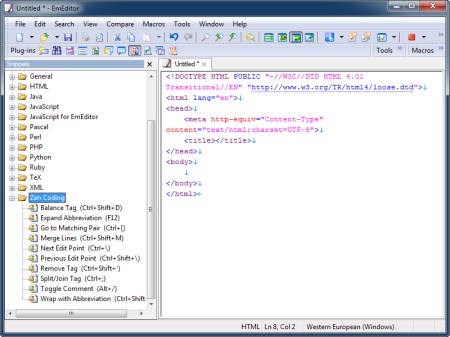 EmEditor ist ein schneller Unicode Texteditor für Windows. Unterstützung von großen Dateien, Makros skriptfähig, CSV-Dateien, Keyword-Highlighting und vieles mehr.