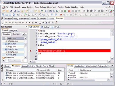 Einer der wenigen PHP Editors mit voller PHP5-Unterstützung, EnginSite PHP Editor ist eine vollständige Entwicklungsumgebung zum Erzeugen, Testen und Debuggen von PHP-Skripts auf Windows 9x/NT/2000/XP-Plattformen. Durch Zusammenfügen von Editier-, Debug- und Test-Werkzeugen unter einer intuitiven, benutzerorientierten Oberfläche, EngInSite PHP Editor erlaubt Ihnen das Erzeugen von hochentwickelten PHP-Anwendungen - direkt auf Ihrem Desktop!