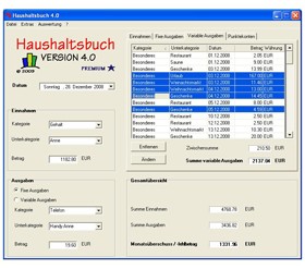 Haushaltsbuch ist ein kostenloses Programm zur Unterstützung bei der täglichen Haushaltsführung. Persönliche oder geschäftliche Einnahmen und Ausgaben werden, unter einfacher Handhabung, übersichtlich aufgelistet, gegenübergestellt und ausgewertet. Haushaltsbuch enthält zwei praktische Zusatzfunktionen, einen Taschenrechner und einen Währungsrechner. Optional kann ein Passwortschutz eingerichtet werden.