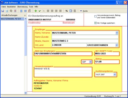 Mit diesem Programm können Auslands-Überweisungen erstellt und auf in eine DTA-Datei geschrieben oder per HBCI online an Ihre Bank übermittelt werden. Einmal eingegebene Überweisungen können als Vorlage gespeichert werden. So können die Daten leicht für eine erneute Buchung übernommen werden. Dies ermöglicht auf einfache Weise auch Sammelüberweisungen, z.B. Gehaltsüberweisungen.