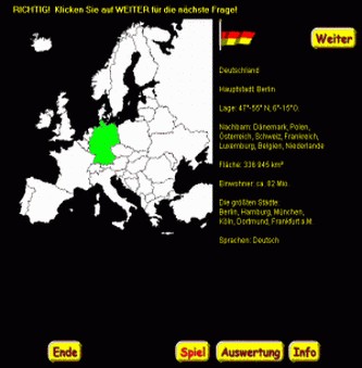 Ein Land von Europa wird farbig angezeigt und Sie erraten das Land.Es gibt jeweils drei verschiedene Antwortmöglichkeiten. Bei richtiger Antwort gibt es Infos zum Land (z.B. Hauptstadt ). Auswertung der richtigen und falschen Antworten