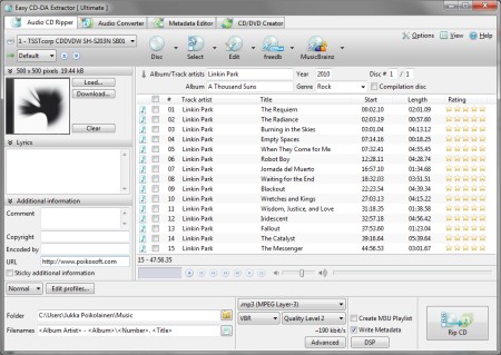 EZ CD Audio Converter ist ein CD-Ripper mit allen Funktionen, die man von einem guten CD-Ripper erwartet. Darunter die Anbindung an die CDDB-Datenbank, um Künstler- und Songinformationen einer CD abzurufen. Zusätzlich wird ein Umwandlungstool geboten, das Musik in alle Formate umwandeln kann, für die ein Codec in Windows installiert ist.