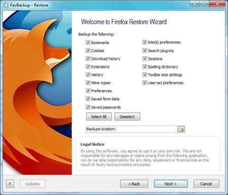 Mit FavBackup kann man das komplette Profil des Browsers speichern und wiederherstellen. So können Lesezeichen, Einstellungen, Cookies, gespeichertes Formulardaten und Passwörter und noch vieles mehr gesichert werden. Unterstützt werden die Browser Firefox, Internet Explorer, Opera, Safari und Chrome.