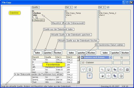 File-Copy kopiert Dateien von einem Quellverzeichnis in zwei Zielverzeichnisse wobei sich jeweis ein Zielverzeichnis abschalten lässt. Es ist also möglich z.B.Bild-Dateien von einer Kamera in ein Stamm.-und Sicherrungsverzeichnis zu kopieren. Neue Unterverzeichnisse können gleichzeitig in den Zielverzeichnissen erstellt werden. Man kann selektierte oder alle Dateien kopieren. Achtung: vorhandene Dateien werden ohne nachfrage überschrieben!!
