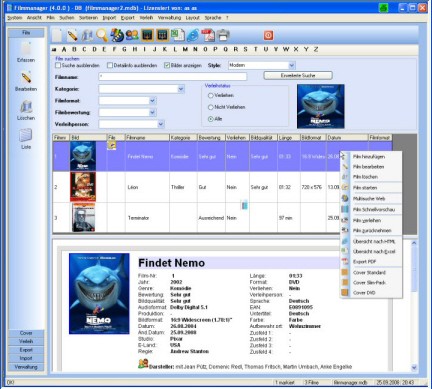 Filmmanager ist ein Filmverwaltungsprogramm mit welchem Sie einfach und komfortabel Ihre Filme im Griff haben. Ob diese Filme als DVD, Video, DivX oder Mpeg vorliegen – alle Formate werden unterstützt und können von Ihnen selbst in den Stammdaten gepflegt werden.