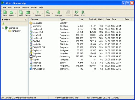 FilZip ist ein kostenloses Utility zum Umgang mit Zip-Dateien und 14 weiteren Archiveformaten. Es unterstützt ace, arj, .cab, .gz, .lha, .jar, .rar, .tar und .zip und andere Dateiformate. Durch die Integration in den Windows Desktop, z.B. durch Drag&Drop, entpacken, packen, testen, konvertieren von Dateien aus dem Kontextmenü heraus, erleichtert und beschleunigt es die Arbeit allen möglichen Archiven.