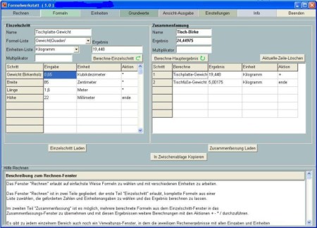 das Rechnen mit verschiedenen Einheiten ohne die Einheiten vorher umbrechen zu müssen z. b. Meter mal Zentimeter, für eine Fläche in Quadratmeter oder Quadratzentimeter und Zentimeter und Millimeter für die Berechung eines Volumens in Kubikmetern oder dem Ergebnis In Kilogramm mit dem Gewünschten Material ist auch möglich.