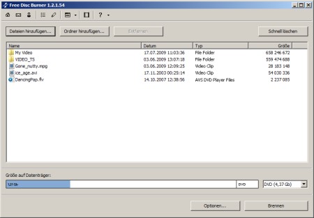 Free Disc Burner brennt alle Dateien oder ganze Ordner auf jede beliebige Disk. Das Programm ist mit einer neuen Brenner-Engine ausgestattet. Das Interface des Programms ist sehr einfach zu verstehen. Free Disc Burner brennt Multi-Session-Disks, kann Informationen von Disks entfernen und unterstützt CD, DVD, Blu-ray.