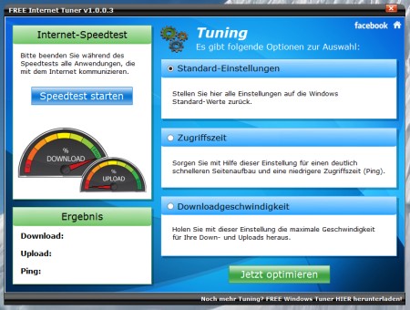 Free Internet Tuner optimiert Einstellungen, die Ihre Internetnutzung verlangsamen und sorgt somit für ein schnelleres Abrufen von Inhalten aus dem Internet. Nur ein Klick ist nötig, um fehlerhafte Einstellungen zu korrigieren und Tweaks für ein besseres Internetvergnügen zu aktivieren.