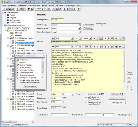 Mit dem Programm "GaebWriter" können auf einfache Art und Weise (drag and drop-Technik) neue GAEB-Dateien erstellt bzw. vorhandene eingelesen und bearbeitet werden. Positionen können nach Excel exportiert werden bzw. auch wieder zurück importiert werden. So können Preise für eine Angebotsabgabe wie gewohnt in Excel kalkuliert und anschließend für die Erstellung der Angebotsabgabe (D84) verwendet werden. Auch ein Export nach Word ist möglich.