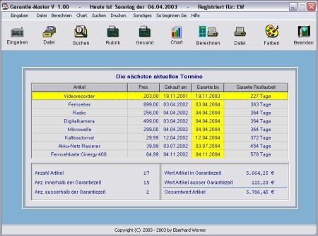 Garantie-Master wird das Garantiedatum Ihrer wertvollen Gegenstände permanent überwachen und in einem von Ihnen festgelegten Zeitraum den Ablauf der Garantiezeit melden.Viele Gegenstände haben heutzutage meistens eine sehr lange Garantiezeit. In dieser doch recht langen Zeit kann manches in Vergessenheit geraten. Garantie-Master erinnert Sie bei jedem PC-Start präzise an ein ablaufendes Garantiedatum, so das Sie immer noch reagieren können.