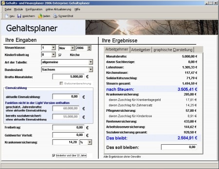 Der Gehaltsplaner 2008 Professional ist viel mehr als ein Brutto-Netto-Lohnrechner. Er berechnt die Rechnungsjahre 1996-2008, kalkuliert AG-Anteile, AG-Belastung inkl. Umlage, AN-Wunschgehalt und AG-\"Wunsch\"belastung. Zusätzlich beinhaltet die Software Rechner zur Wahl der Steuerklassen, zu den allg. u. besonderen Lohnsteuertabellen, zur Abfindungs- und zur Rentenplanung.