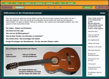 Die Kinderlieder-Gitarrenschule für Anfänger; sowohl im Selbststudium als auch im Gitarrenunterricht einsetzbar; mit Midis, Fotos und nützlichen interaktiven Funktionen; Lerninhalt: Akkorde, Rhythmen, Liedbegleitung, 11 Kinderlieder zum Anhören und Mitspielen in verschiedenen Levels; Kontrollfunktion
