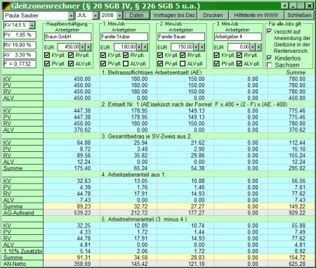 Freeware-Programm für die Berechnung der Sozialversicherungsbeiträge in der Gleitzone. Besonderheiten: Eine Berechnung umfasst eine Hauptbeschäftigung und bis zu 3 Minijobs. Für jeden der 4 SV-Zweige kann die Versicherungspflicht eingestellt werden. So sind alle vorkommenden Fälle darstellbar. Es können 10 Personalfälle verwaltet werden. Für jeden Personalfall sind die Monatsberechnungen für die Jahre 2006 bis 2010 bereits vorbereitet.