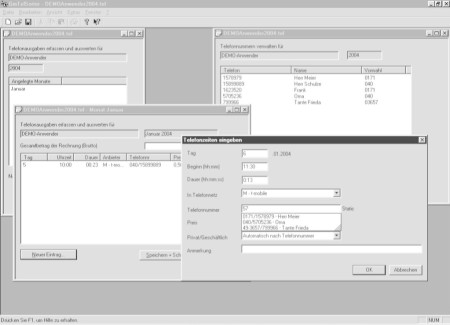 Mit diesem Programm können Sie Ihre Telefonrechnung verwalten. Es hilft die Telefonrechnung so auszuwerten, dass die private und geschäftliche Nutzung unterschieden werden kann. Dazu versucht es mit verschiedenen Algorithmen, die günstigste Variante z.B. für die Angabe beim Finanzamt für die Steuererklärung herauszubekommen. Die Erfassung kann sehr schnell über den Nummernblock geschehen oder über Import des Einzelverbindungsnachweises.