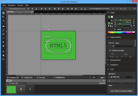 Der Google Web Designer ermöglicht das erstellen von Objekten und Inhalten in HTML5. Primär ist er dafür gedacht Werbeanzeigen in HTML5 zu erstellen, kann aber auch für andere Objekte verwendet werden. Er bietet eine Design-Ansicht, ähnlich wie bei Bildbearbeitungsprogrammen, mit zahlreichen Werkzeugen, z.B. Animationen oder 3D-Effekte. Man kann aber auch ein eine Code-Ansicht umschalten und direkt den Quellcode arbeiten.