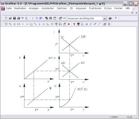 Grafiker 5 ist ein vektororientiertes Zeichenprogramm zur Erstellung von (wissenschaftlichen) Abbildungen und Zeichnungen. Es enthält einen umfangreichen Satz von Zeichenbefehlen und ermöglicht die Darstellung von mathematischen Funktionen. Die erstellten Abbildungen können exportiert werden und damit problemlos in anderen Programmen (z. B. Textverarbeitung, Präsentationsprogramm) weiterverarbeitet werden.