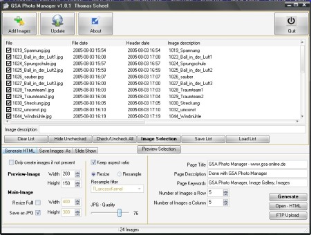 Mit dem Programm ist die Auswahl Ihrer Favoritenbilder ein Kinderspiel, sei es zur Organisation von Diaschauen oder einfach zur Sichtung und Auswahl Ihrer Fotos. Treffen Sie Ihre Wahl schnell und elegant im Einzelbilddurchlauf oder lassen Sie sich bei Ihrer Entscheidung in einer Mehrfachbild-Vorschau unterstützen. Ihre Bilder können in neue Formate gespeichert werden, zur Webseite verarbeitet werden (incl. FTP-Upload) und vieles mehr.