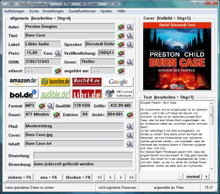 bringt auf einfachste Weise Ordnung und Übersicht in Ihre Hörbuch-Sammlung. Highlights: - übersichtliche Anzeige aller relevanten Daten - Cover und Inhaltsangabe können mit angezeigt werden - Zugriff auf online-Datenbnak mit tausenden Einträgen - direkte Übernahem aller Daten - direkte Links zum Titel bei großen Anbietern und Google - Sortierung nach allen möglichen Kriterien auf Knopfdruck - umfangreicher Listengenerator - Life-Update-Funktion