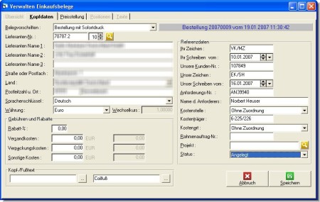 Das Bestellwesen ist ein komplettes Programmpaket zur Unterstützung des Einkaufs und beinhaltet alle Funktionen, die Sie benötigen, um Anfragen und Bestellungen effizient zu bearbeiten. Anfragen und Bestellungen können aufgrund von Bestellvorschlägen, Bestellvormerkungen oder direkt über das Programm Verwalten Einkaufsbelege ausgelöst und auf Wunsch per E-Mail oder Telefax versendet werden.