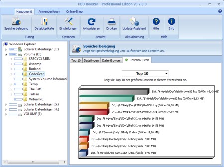 Kennen Sie das Problem von immer langsamer werdenden Festplatten und sich nahezu selbstständig verflüchtigendem Speicherplatz? HDD-Booster schafft Abhilfe! Grafische Auswertungen stellen die Auslastung Ihrer Festplatten und Speichermedien optisch dar und unterstützen Sie bei der Suche nach den großen Speicherfressern. Die ausgereifte Duplikatsuche ermöglicht zudem das Identifizieren von Dateidubletten.