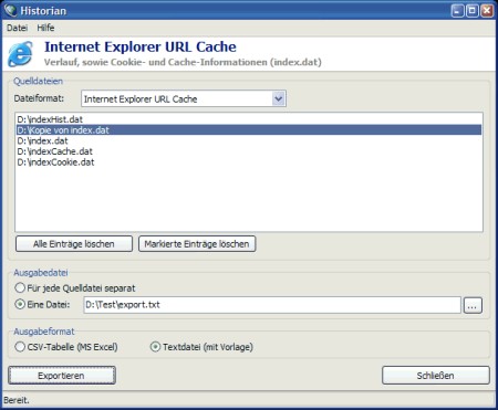 Historian liest Verlaufsdateien, Favoriten, Cookies und sonstige Dateien der gebräuchlichsten Webbrowser aus und exportiert diese in eine CSV-Tabelle oder in eine Textdatei.