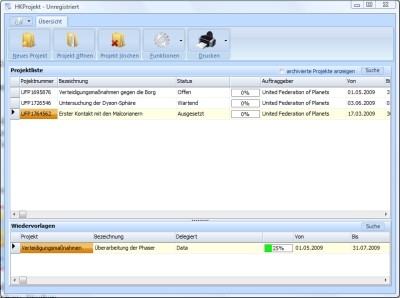 HKProjekt bringt Ordnung und Übersichtlichkeit in Ihre Projekte. Sie können Ihre Projekte und deren Aufgaben sofort in eine Liste an Ihrem PC schreiben. Das können Rückrufzusagen, wie die für den Tag geplanten Aufgaben der Projekte, die es zu erledigen gilt, bis hin zu Ihren neuen Ideen sein. So entsteht eine vollständige Projektliste mit deren Aufgaben.