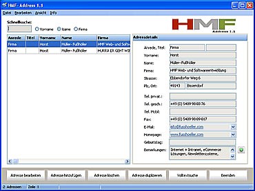 HMF- Adress ist eine einfach zu bedienende Adressverwaltung für Windows und verfügt über alle Funktionen zum Management von Adressdaten wie zum Beispiel die Neueingabe, dass Ändern und Löschen. Eine Volltext-Suche ermöglicht zudem das schnelle Auffinden von Adressen. HMF- Adress muss nicht installiert werden und kann daher direkt auf einen USB-Stick kopiert werden.