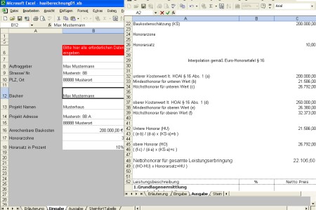 berechnet das Honorar für Architekten und Ing. nach der HOAI § 16 und gibt ein komplettes Angebot aus, eine Abstufung nach der Steinfort Tabelle ist ebenfalls möglich, sowie die herausnahme von einzelnen Leistungsphasen. Für die Berechnung wird nur die Bausumme , die Bauwerkskategrie und der Honorarsatz benötigt. Mit der Eingabe der Kundendaten kann der Ausdruck ohne weiteres als Angebot an den Kunden weitergegeben werden.