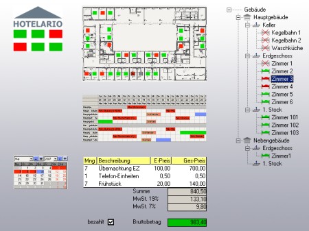 Hotelario ist ein netzwerkfähiger Reservierungsplaner und dient zur Buchung von Raumbelegungen für Hotels und Pensionen. Buchungen können direkt auf Etagenplänen oder in einem Belegungsverlauf (Zeitachse) platziert werden. Von allen Arbeitsplätzen im Netzwerk können Sie Reservierungen sichten und buchen. Mit einem Rechnungsmodul erstellen Sie Rechnungen für die beanspruchten Hotelleistungen.