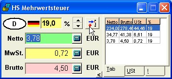 Das Programm berechnet simultan Nettopreis, Mehrwertsteuer und Bruttopreis. Sie können jeden Wert ändern, die anderen Werte werden jeweils korrekt dazu ausgerechnet. Für 27 europäische Länder (die 25 EU-Länder sowie Schweiz und Norwegen). Der Mehrwertsteuersatz ist auch beliebig änderbar. Einzelne Datensätze lassen sich tabellarisch listen, kopieren und drucken.