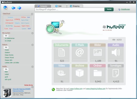 Hulbee Desktop ist eine kostenlose Desktop-Such-Software für Privatnutzer. Mit Hilfe der "Data Cloud", einer Wolke aus Begriffen, ermöglicht sie dem Nutzer, seine Suche selbst thematisch einzugrenzen und so schneller ans Ziel zu gelangen.