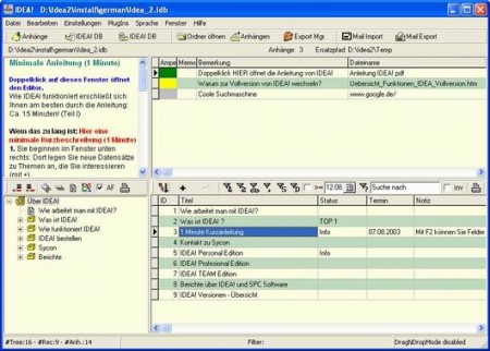 Organisieren Sie Ihr Wissen und Informationen auf einfache, schnelle und höchst flexible Weise. Genau gemäß Ihren Bedürfnissen. Während der täglichen Arbeit. Sparen Sie sich eine Menge Zeit und Arbeit. IDEA! ist weder an eine spezielle Branche noch an eine bestimmte Abteilung gebunden. Es organisiert beliebige Inhalte aus unterschiedlichsten Quellen. Ein einziger Bildschirm macht alles sofort greifbar. Für Einzelanwender und Gruppen.
