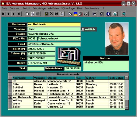 Der IEA-Adress-Manager (IAM) das Adress-Verwaltungsprogramm für Privatpersonen. Es beinhaltet mächtige Funktionen, was den Arbeitsaufwand reduziert und man einfach nur Spaß bei der Bedienung hat. So können zum Beispiel Fotos (Format 2/3) ohne großen Aufwand direkt in den Datensatz eingebunden werden. Bei Bedarf schnelle Sortierungen mit 1 Klick! Ein SQL-Modul zum Auffinden der "Stecknadel im Heuhaufen" ist integriert, ebenso wie ein Email-Client