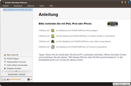 ImTOO iPad Mate Platinum stellt zuverlässige und umfangreiche Hilfe für das iPad dar. Mit dem Programm können von Multimediadateien, einschließlich Musik, Film, Foto sowie Bücher, Dateien vom lokalen Computer auf die mobilen elektronischen Geräte verschoben und DVD, CD, Audio- und Videodatei zu iPad Film und Musik konvertiert werden. Es läd in nur einem Schritt ein Onlinevideo herunter und konvertiert es in ein kompatibles iPad-Format.