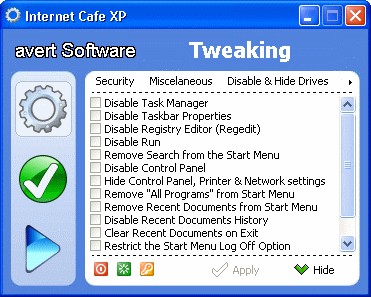 Internet Cafe XP schränkt Rechte auf einem Computer ein und kann diese individuell konfigurieren. So kann zum Beispiel der zugriff auf den Taskmanager oder den Registry-Editor gesperrt werden.